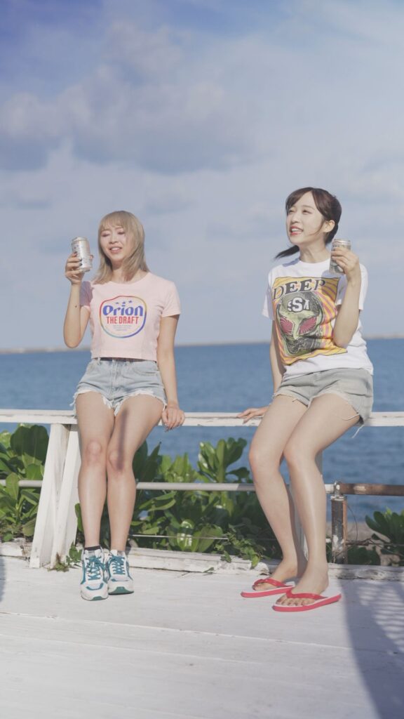沖縄の海で、昼からビールを飲むプロレス好きのアオイとミサキ。